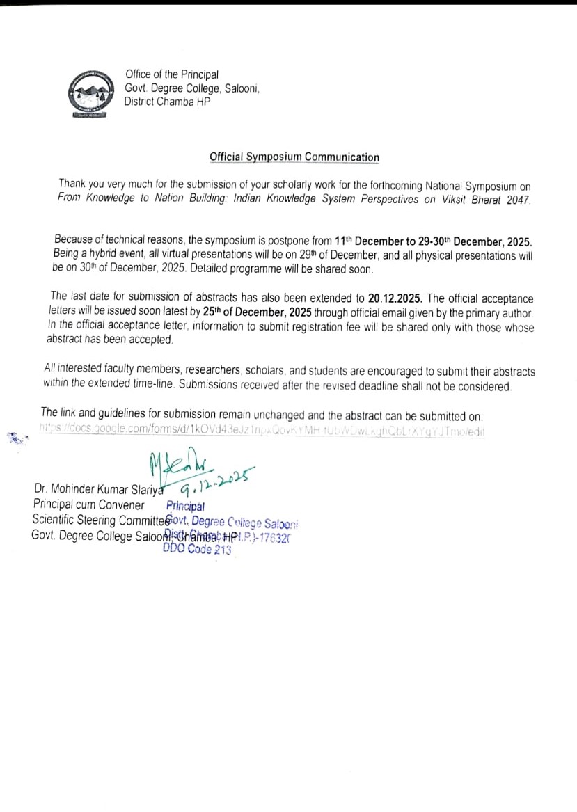 Government Degree College at Salooni, District Chamba (HP) was established by Government of Himachal Pradesh in September 2006 as co-educational college. Salooni is situated at a distance of about 50 km from the district headquarter Chamba and at an altitude of 1850 meters. The college is surrounded by beautiful cedar trees and apple orchards. Courtyard of the college gives a stupendous view of almost half of the area of Chamba district. At one end of the mid Himalayan range fronting the college stands the snowcapped Sach pass. Other end gradually descends into the Dain kund and Kala Top before eventually making the view of Dalhousie visible. In the darkness of night, the twinkling lamps in Dalhousie town look as if a constellation of young stars had come as pilgrims to earth. The clustered hamlet of houses visible from the college on the front mountain dazzles like a pearl when the sun shines bright during the day. The pleasant weather for the larger part of the year adds yet another feather. This makes Salooni valley a real paradise for every visitor.